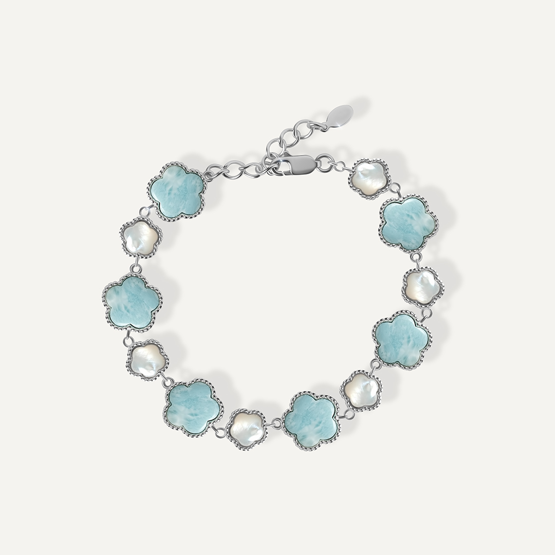 Серебряный браслет с ларимарами и перламутром "Цветы"