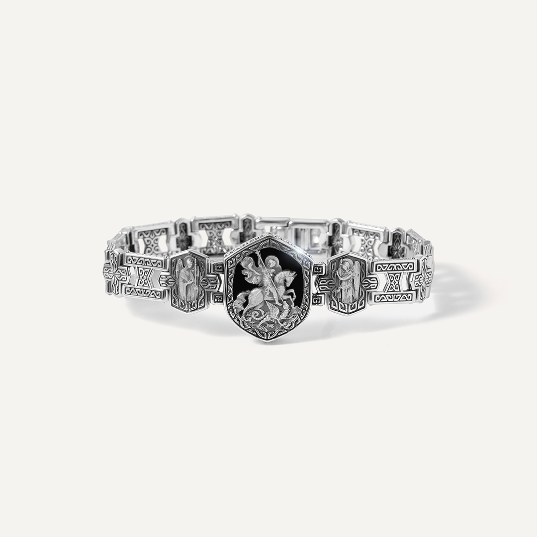 Серебряный браслет с фианитом "Святой Георгий Победоносец моли Бога о нас"