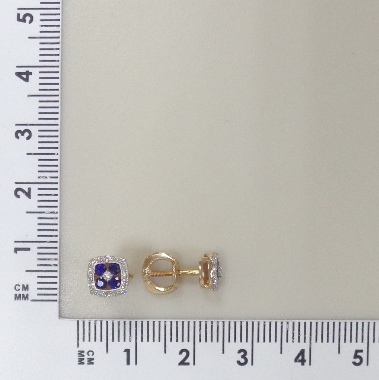 Золотые серьги-пусеты 585 пробы; родий; вставки 8 Сапфир 0,306 2/2; 2 Бр.Кр-17 0,015 2/2А; 32 Бр.Кр-