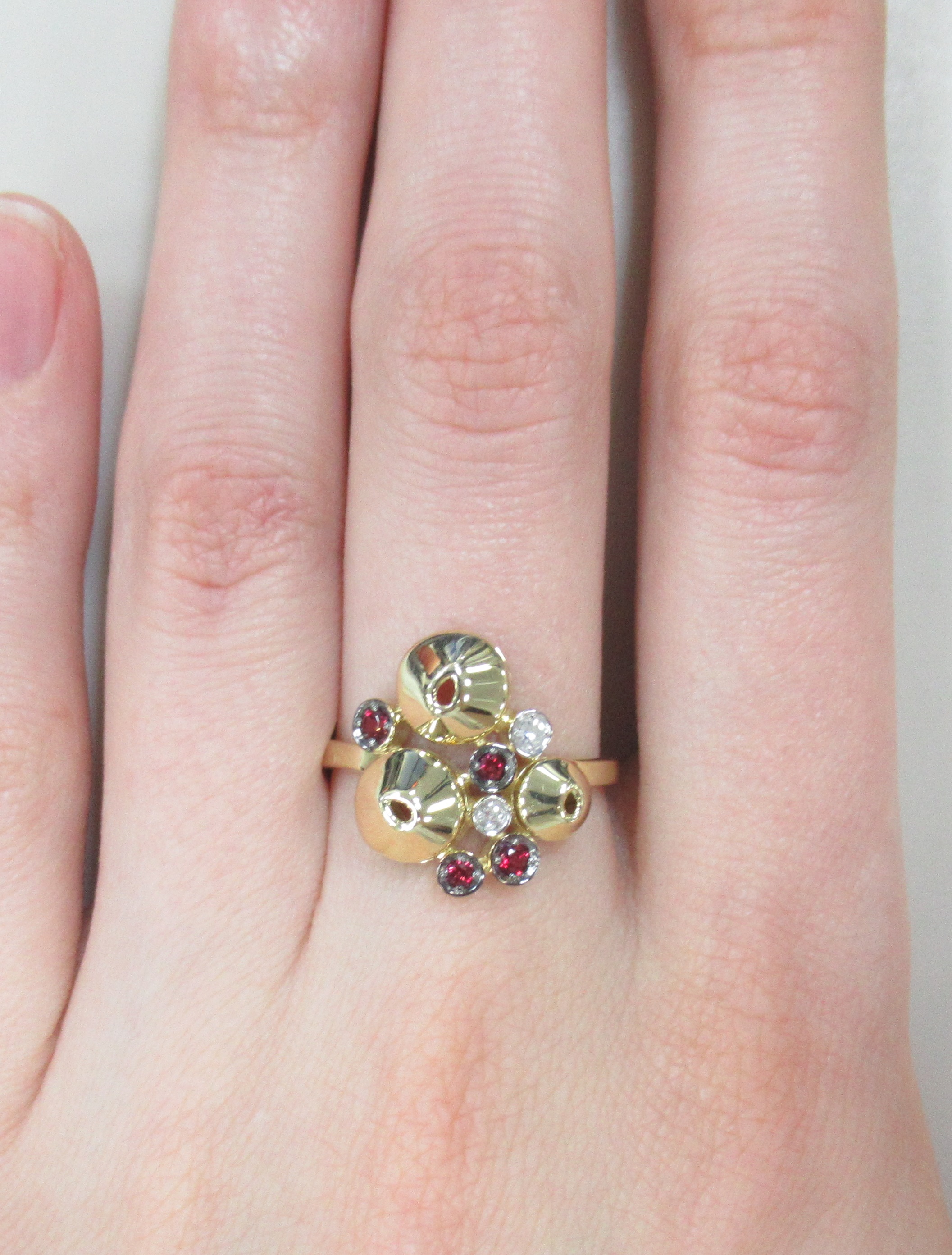 Незамкнутое кольцо из золота с рубинами и бриллиантами "Стрела"