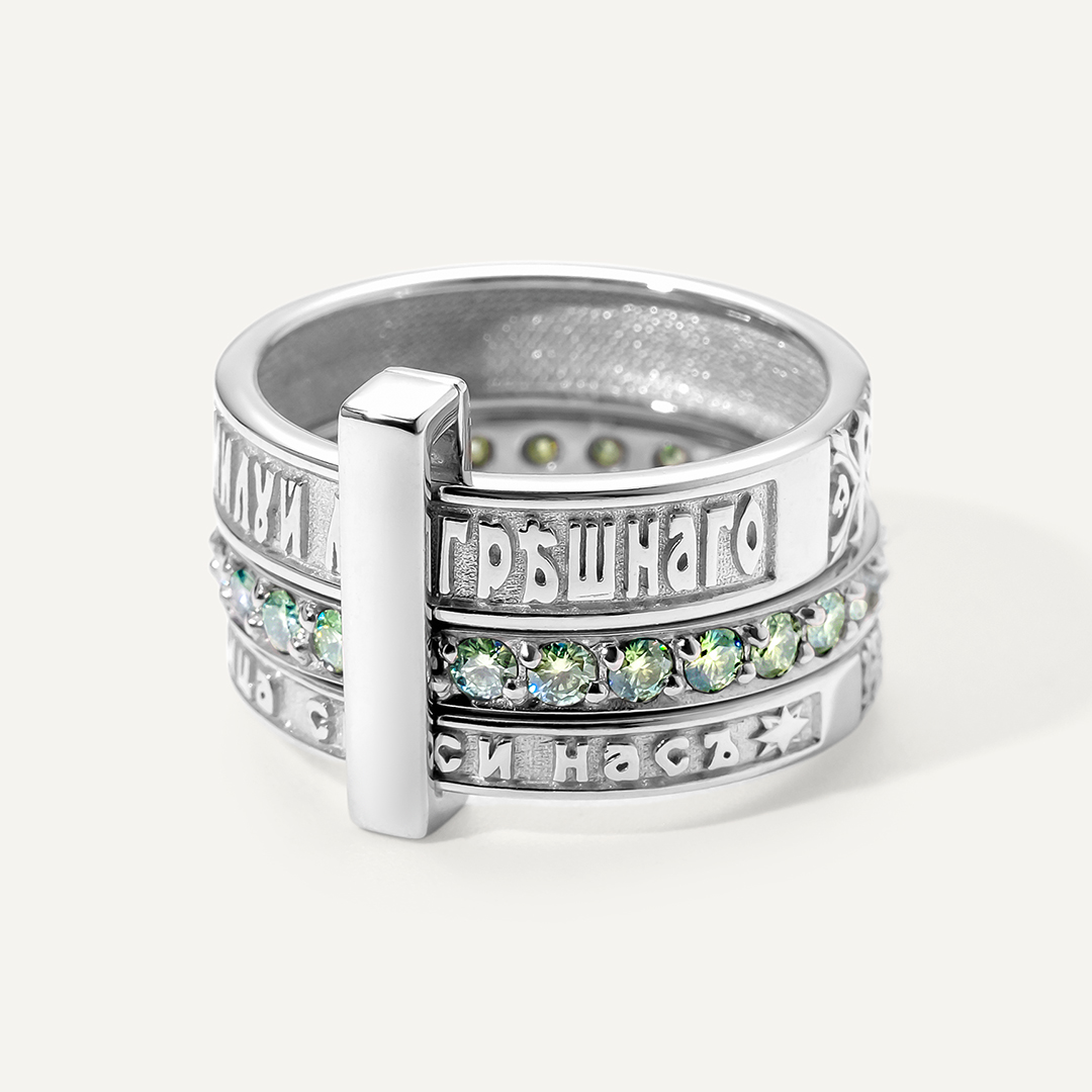 Серебряное кольцо с зелеными муассанитами "Иисусова молитва"