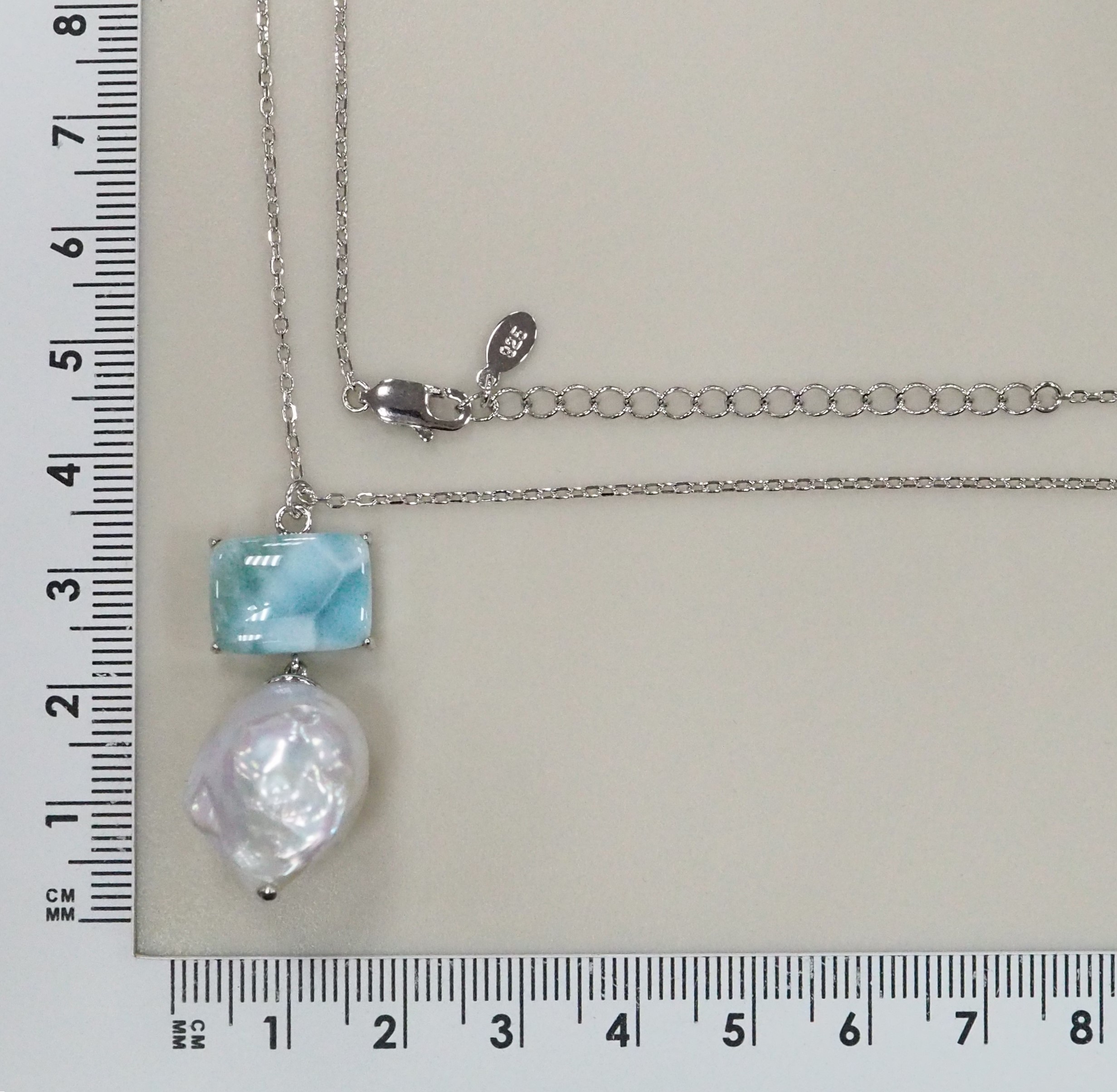 Серебряное колье с ларимаром и жемчугом Барокко