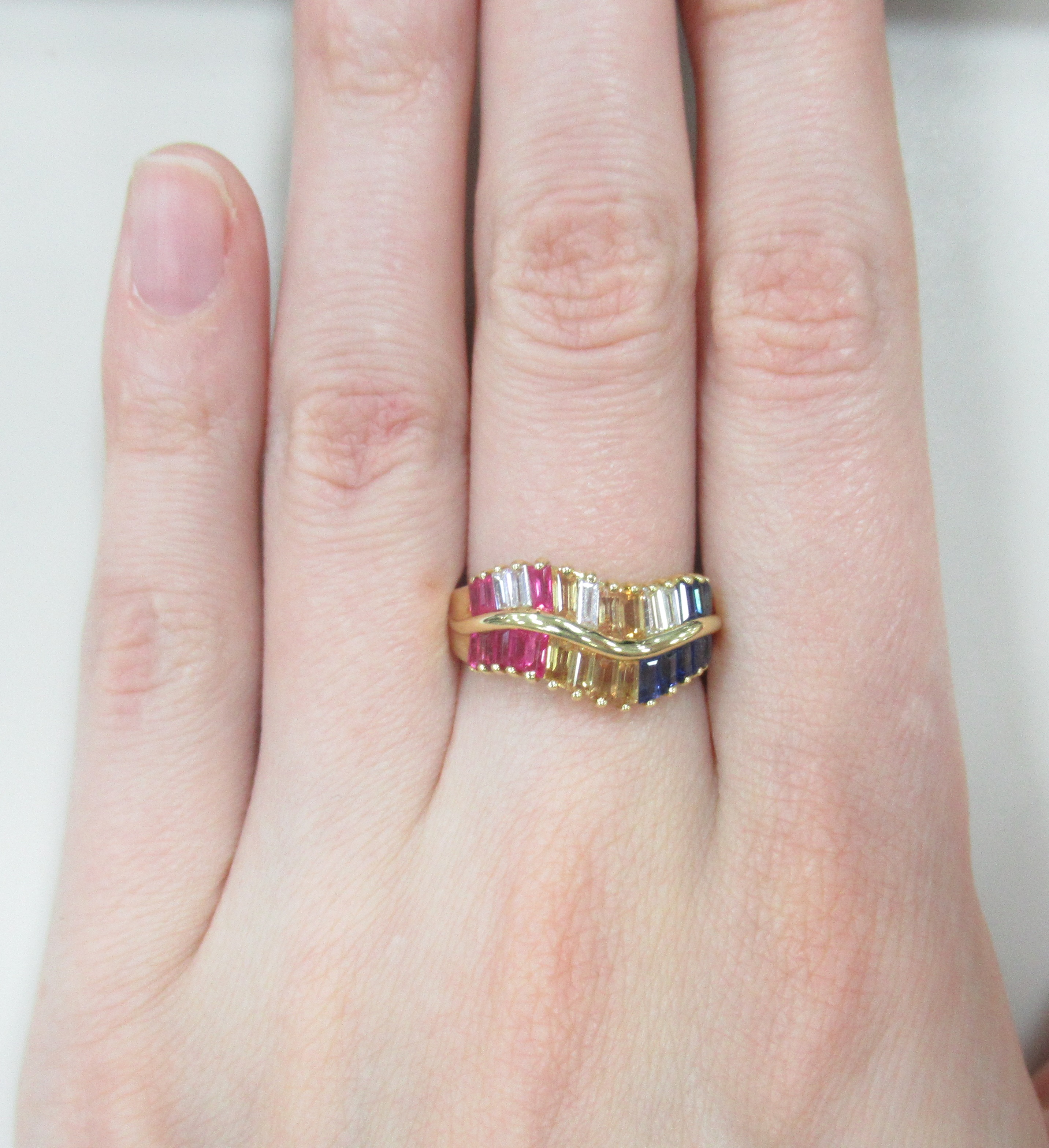 Кольцо из желтого золота с рубинами. бриллиантами и сапфирами
