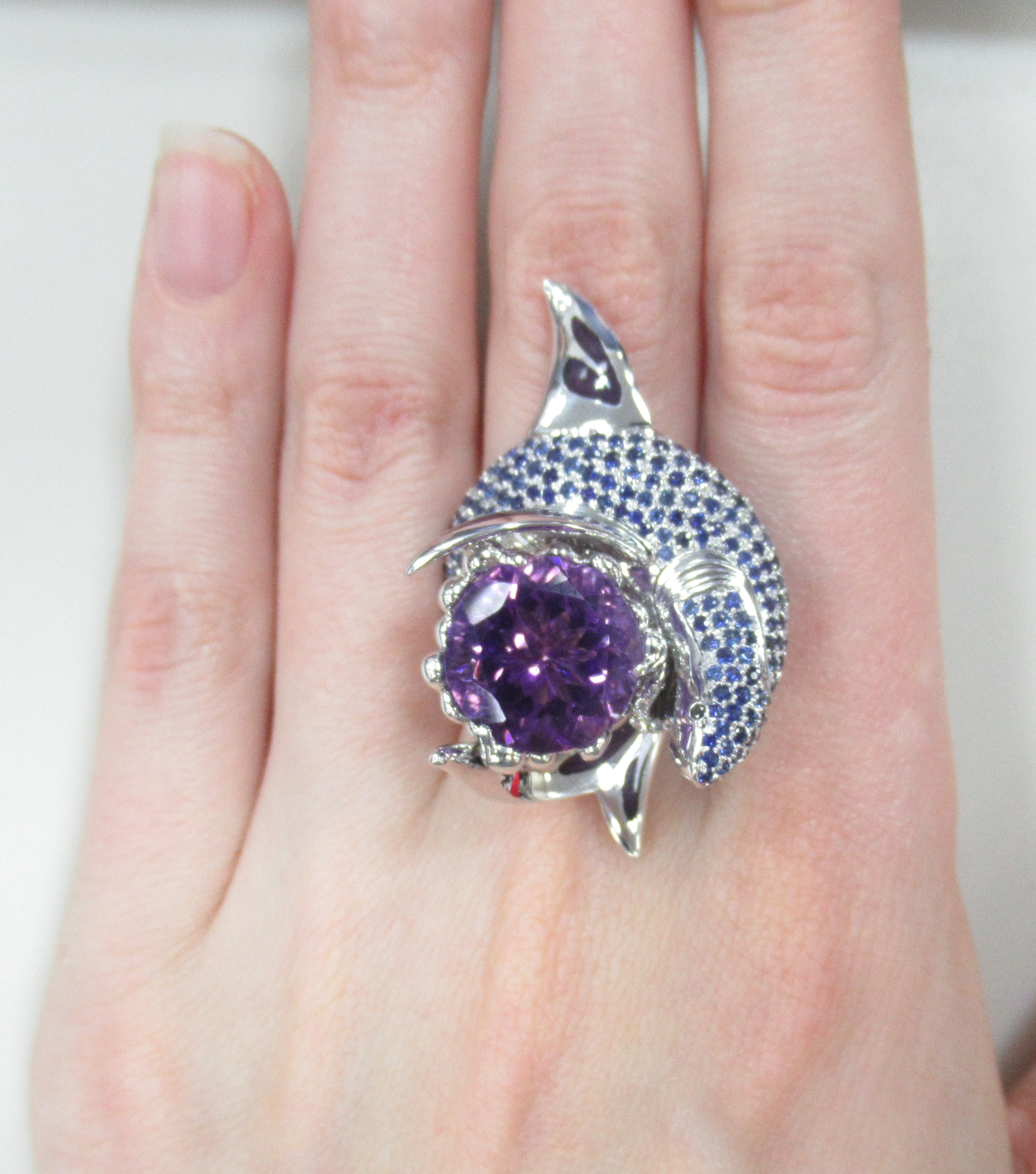 Кольцо из белого золота с аметистом и сапфирами "Акула"