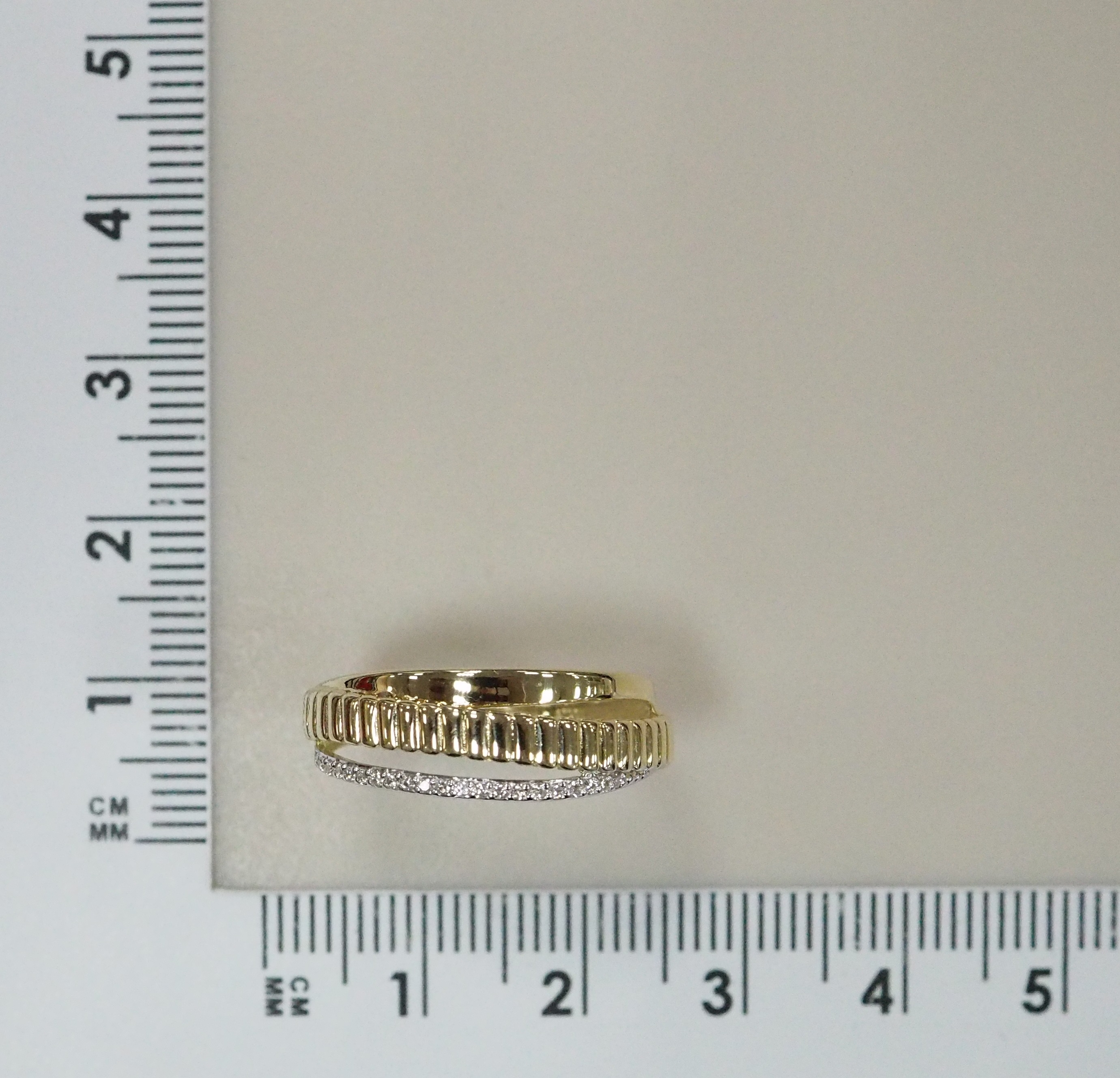 Золотое кольцо 585 пробы; желтое золото; родий; вставки 1 Бр.Кр-57 4/5А 0,031; 6 Бр.Кр-57 4/5А 0,097