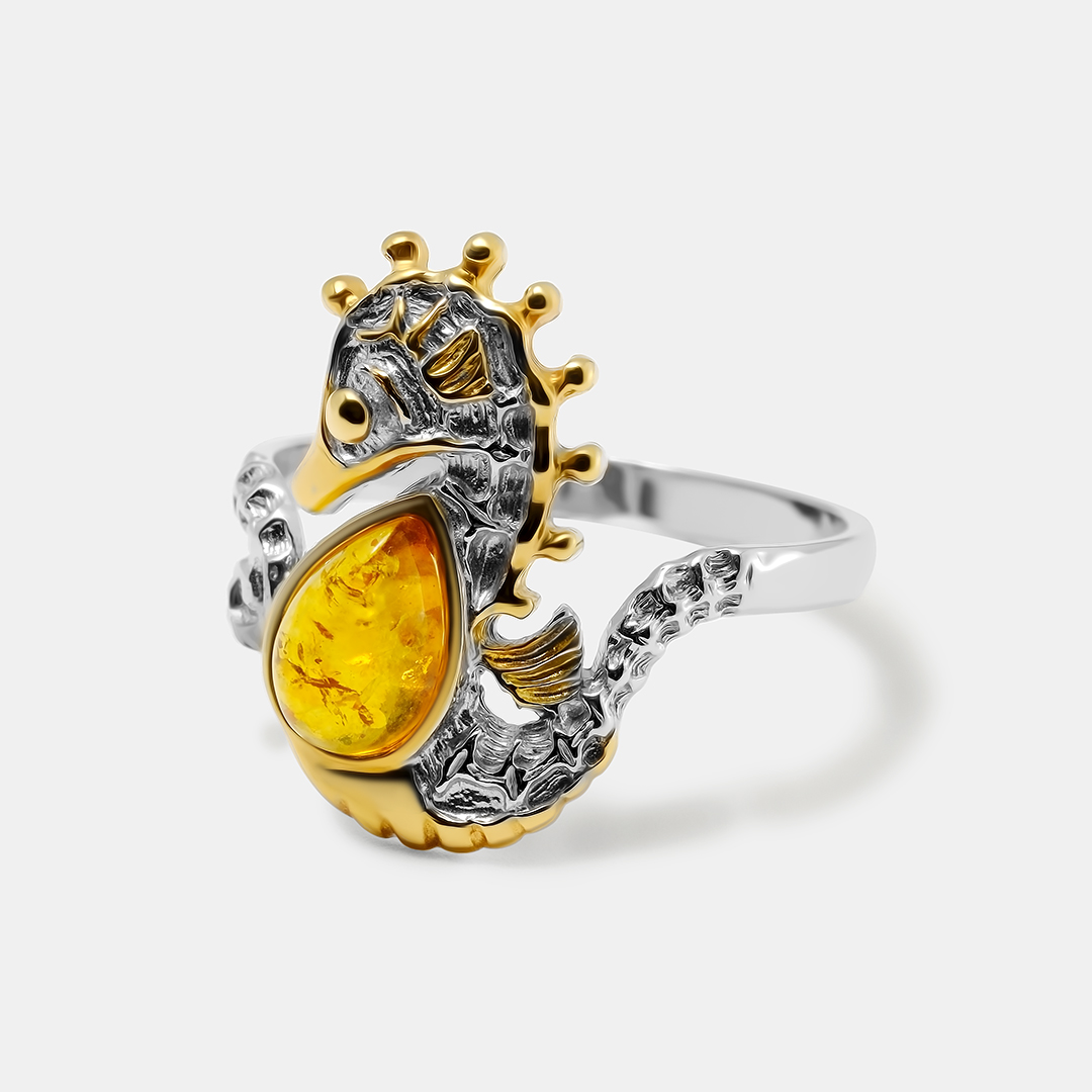Серебряное незамкнутое кольцо с зеленым янтарем
