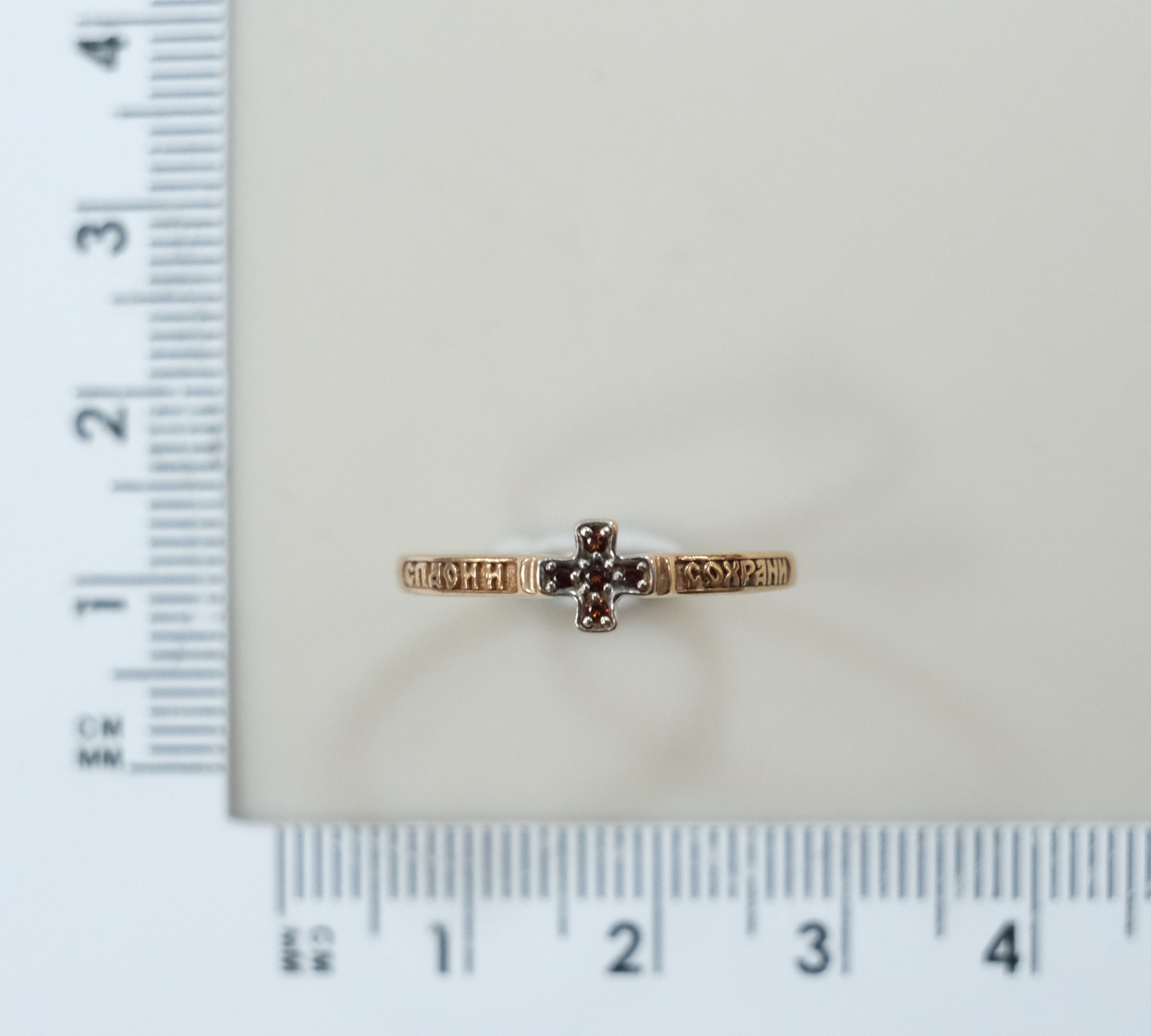 Золотое кольцо 375 пробы; родий; Спаси и Сохрани; вставки 5 Гранат;