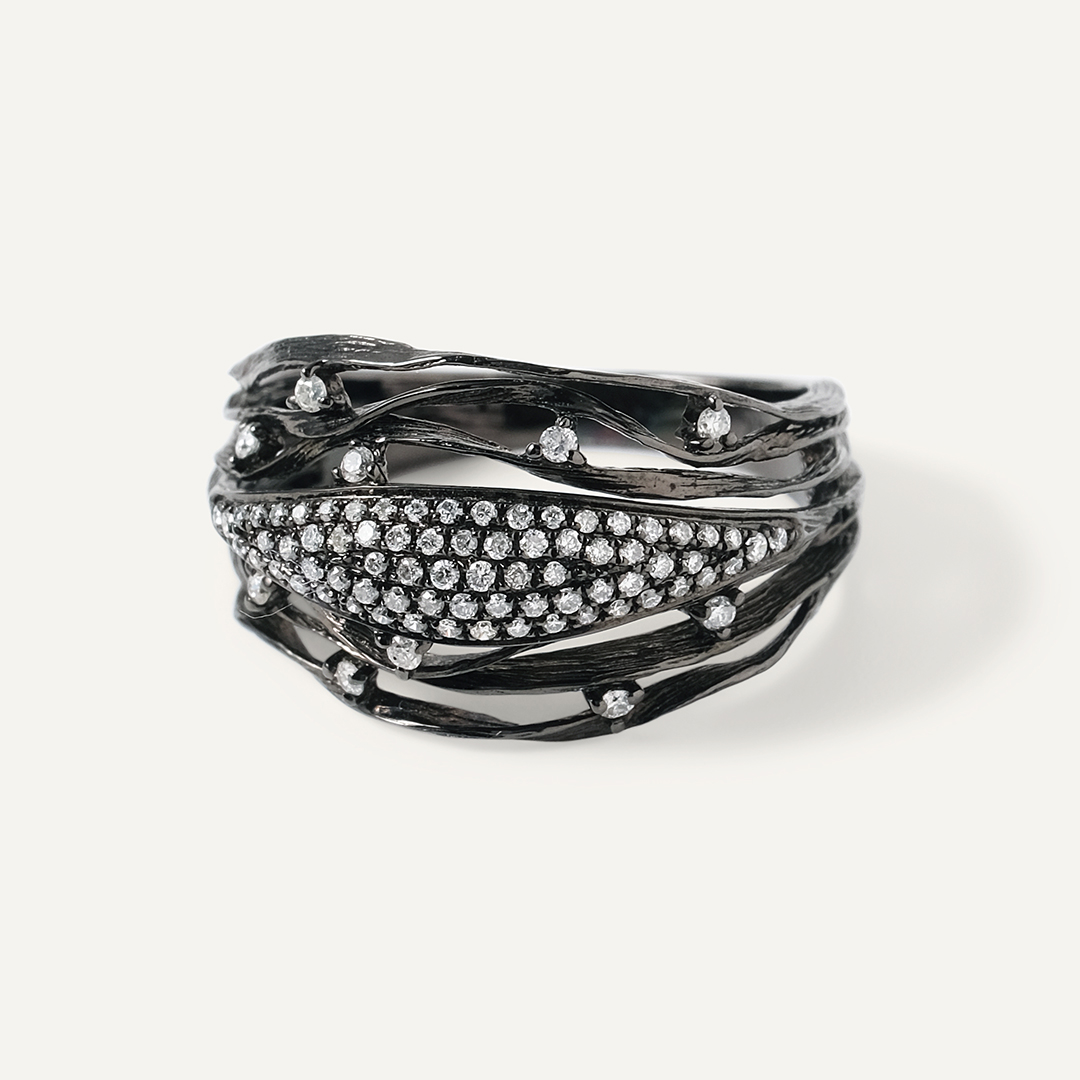 Серебряное кольцо 925 пробы; вставки 1 Фианит черн.; 8 Фианит бесцв.;