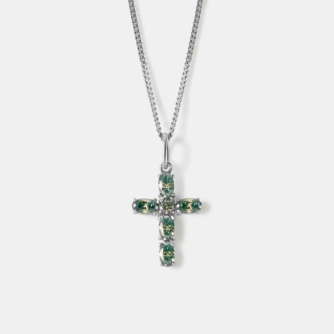 Серебряная подвеска-крест с зелеными муассанитами