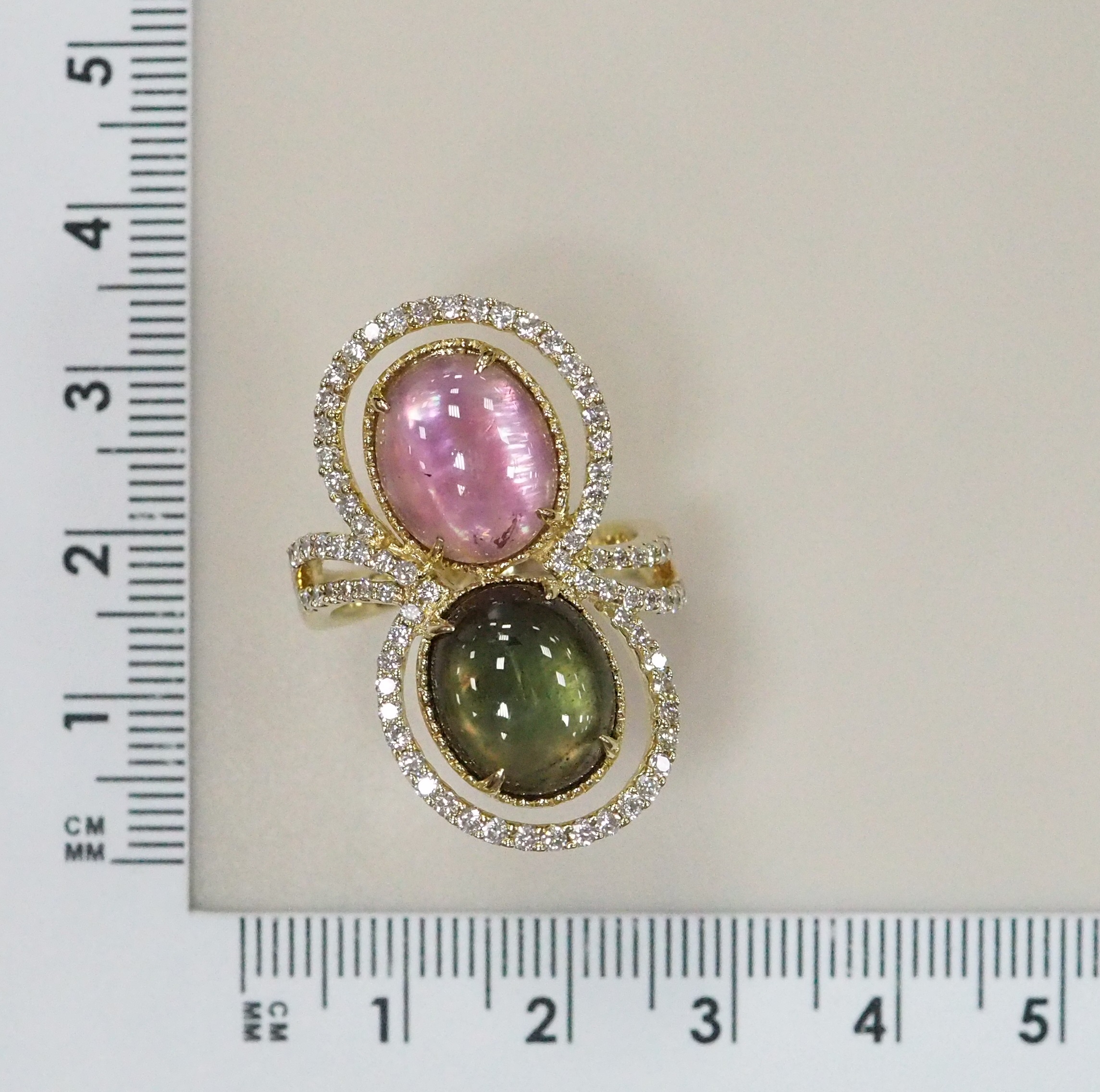 Незамкнутое кольцо из желтого золота с родолитами, агатами и шпинелью "Змея"
