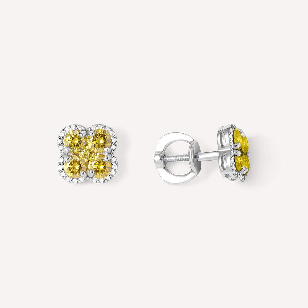 Серьги-пусеты из белого золота с желтыми бриллиантами "Клевер"
