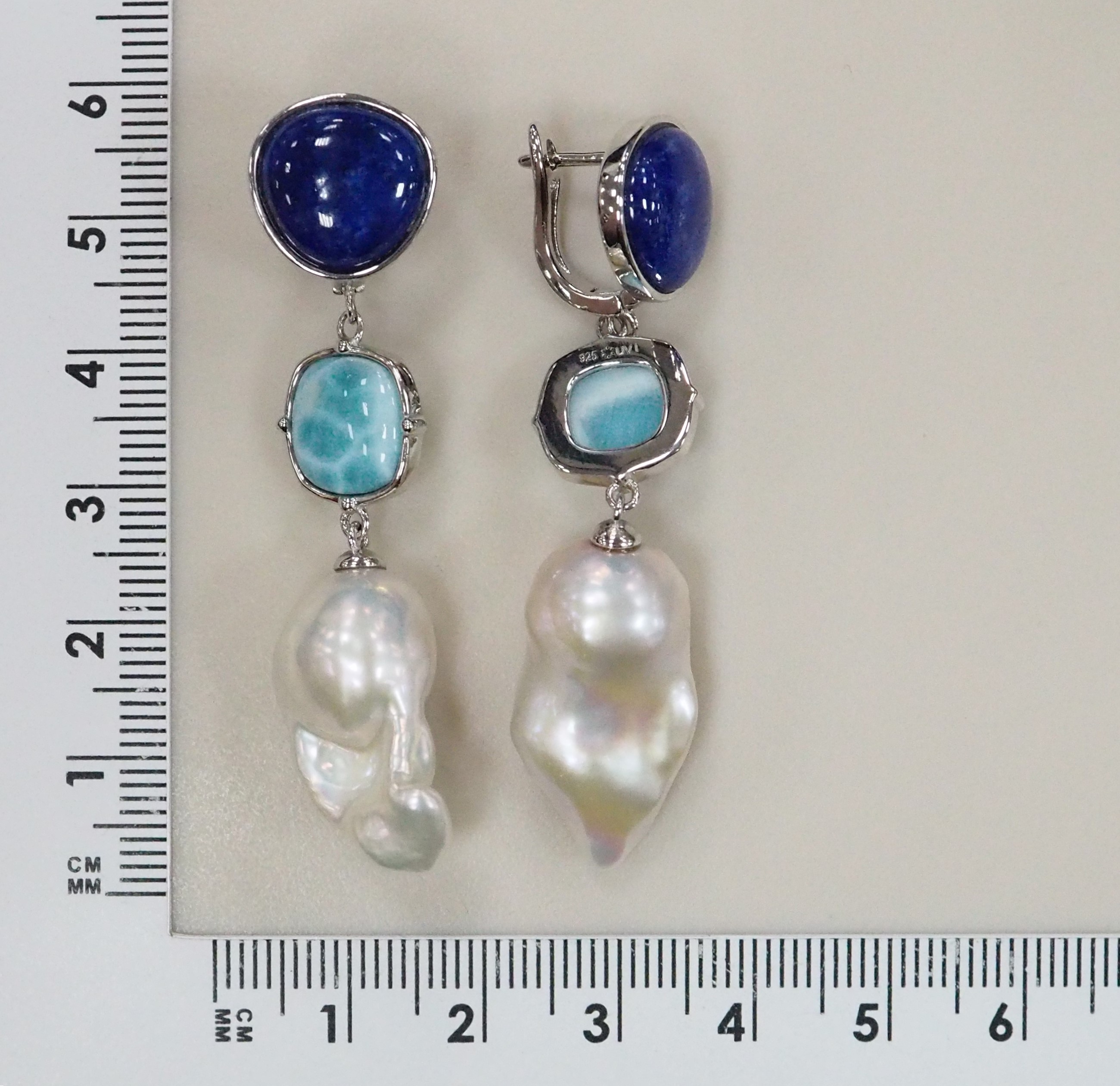Серебряные серьги с ларимарами, лазуритами и жемчугом Барокко