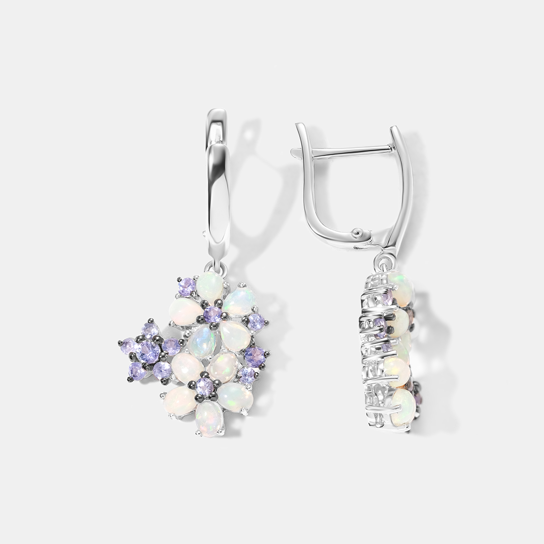 Серебряные серьги с опалами и танзанитами "Цветы"