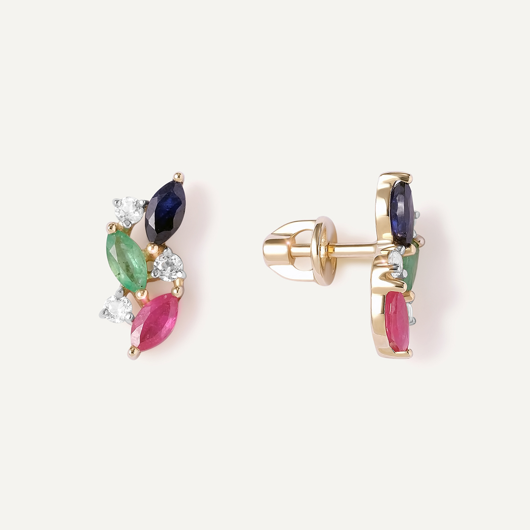 Серьги-пусеты из желтого золота с изумрудами, сапфирами и рубинами