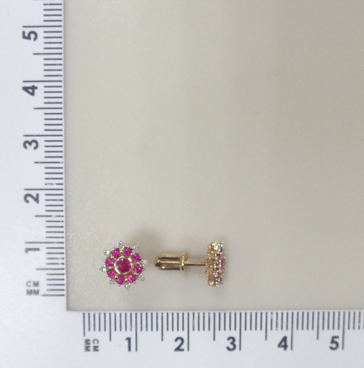 Золотые серьги-пусеты 585 пробы; родий; вставки 2 Рубин 0,193 2/2А; 16 Рубин 0,257 2/2А; 16 Бр.Кр-17