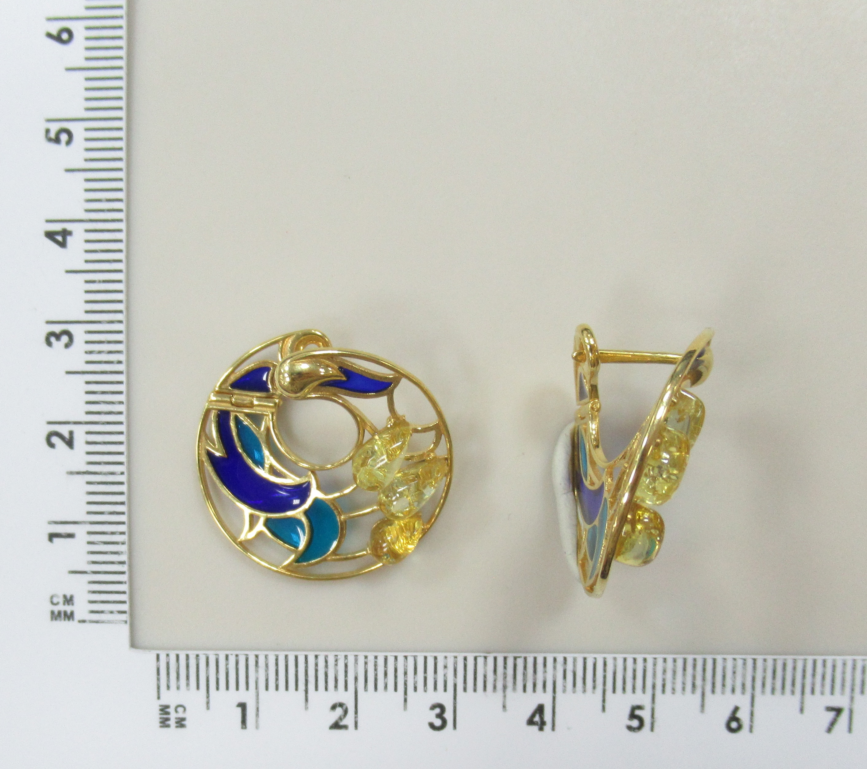 Серебряные серьги с янтарем и эмалью "Цветы"