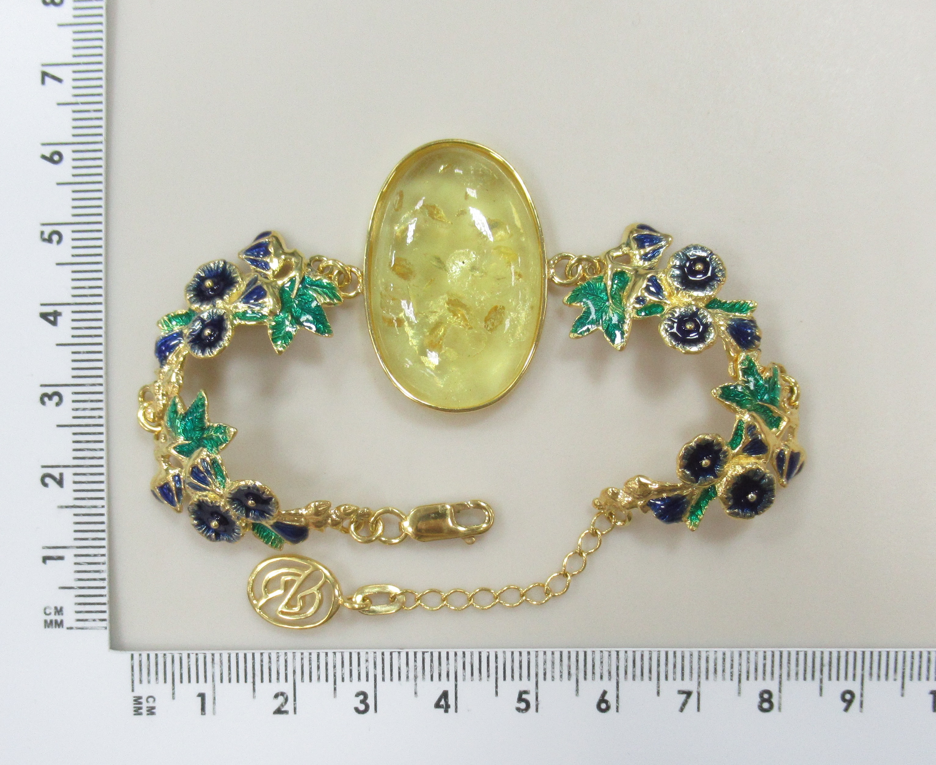 Серебряный браслет с янтарем и эмалью "Цветы"