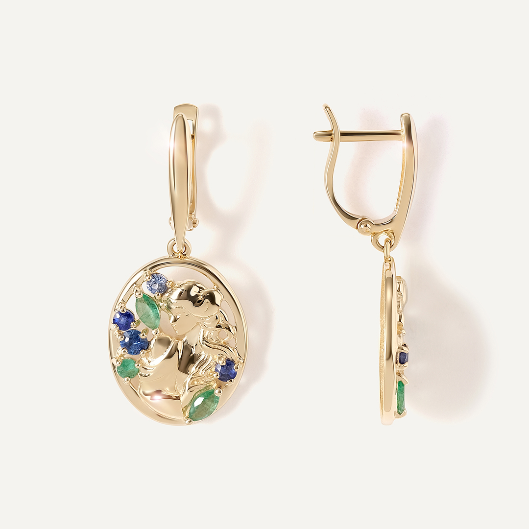 Серьги из желтого золота с изумрудами и сапфирами