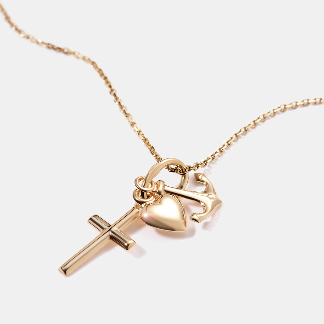 Подвеска из желтого золота "Вера, Надежда, Любовь". Материал: желтое золото 375 пробы. Тройной символ, состоящий из креста, сердца и якоря, олицетворяет главные христианские добродетели: "Веру, Надежду, Любовь". Такой талисман позволяет справляться со всеми жизненными трудностями, давая человеку надежную опору. Золото 375 пробы содержит ровно 37,5% чистого золота, к которому может добавляться серебро, медь, палладий и другие компоненты. Главным преимуществом украшений является их прочность и долговечность. Также они привлекают своей ценой, при этом качество практически не отличается от аналогов с более высоким показателем пробы.